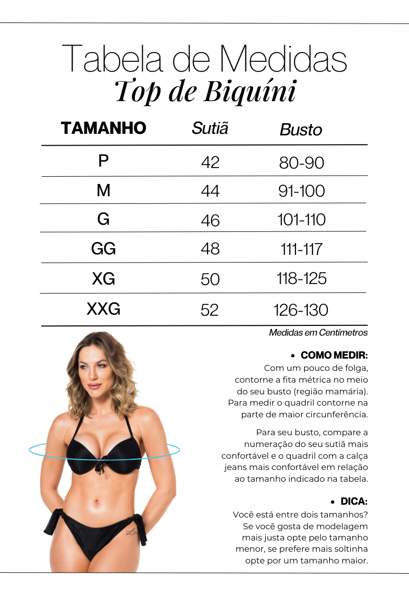 Na Top Model você escolhe as peças separadamente para combinar como preferir. A dupla mais amada com este top é a Calcinha Drapeada, que entrega firmeza e muito conforto ao vestir. Resultado: conjunto elegante, seguro e prático para viagens, beach clubs e sunsets.